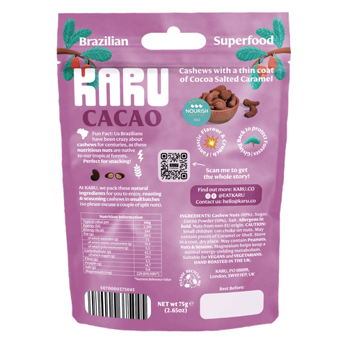 Coming back from a trip to Brazil with a bag of salted cashews, our founder decided that everyone should be able to enjoy these superfood snacks in the same way: roasted to lock in their natural flavours. That's how KARU was born!