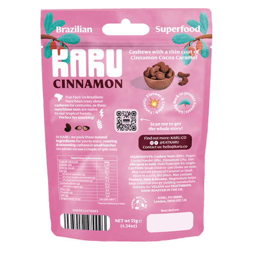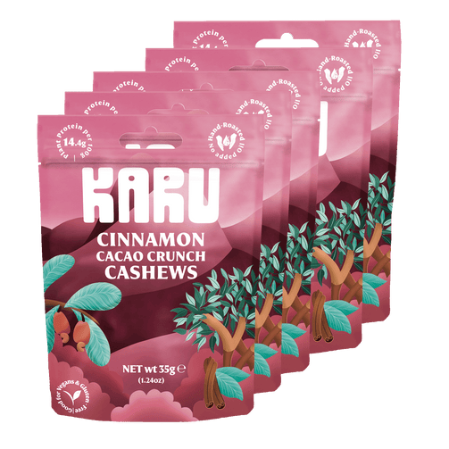Our KARU Cinnamon Cacao Crunch has a warm sweet crunch from hand roasting the cashews with cinnamon, cacao and a thin coat of salted caramel. A delightful mix creating delicious vegan sweets, without any dairy, and gluten-free.